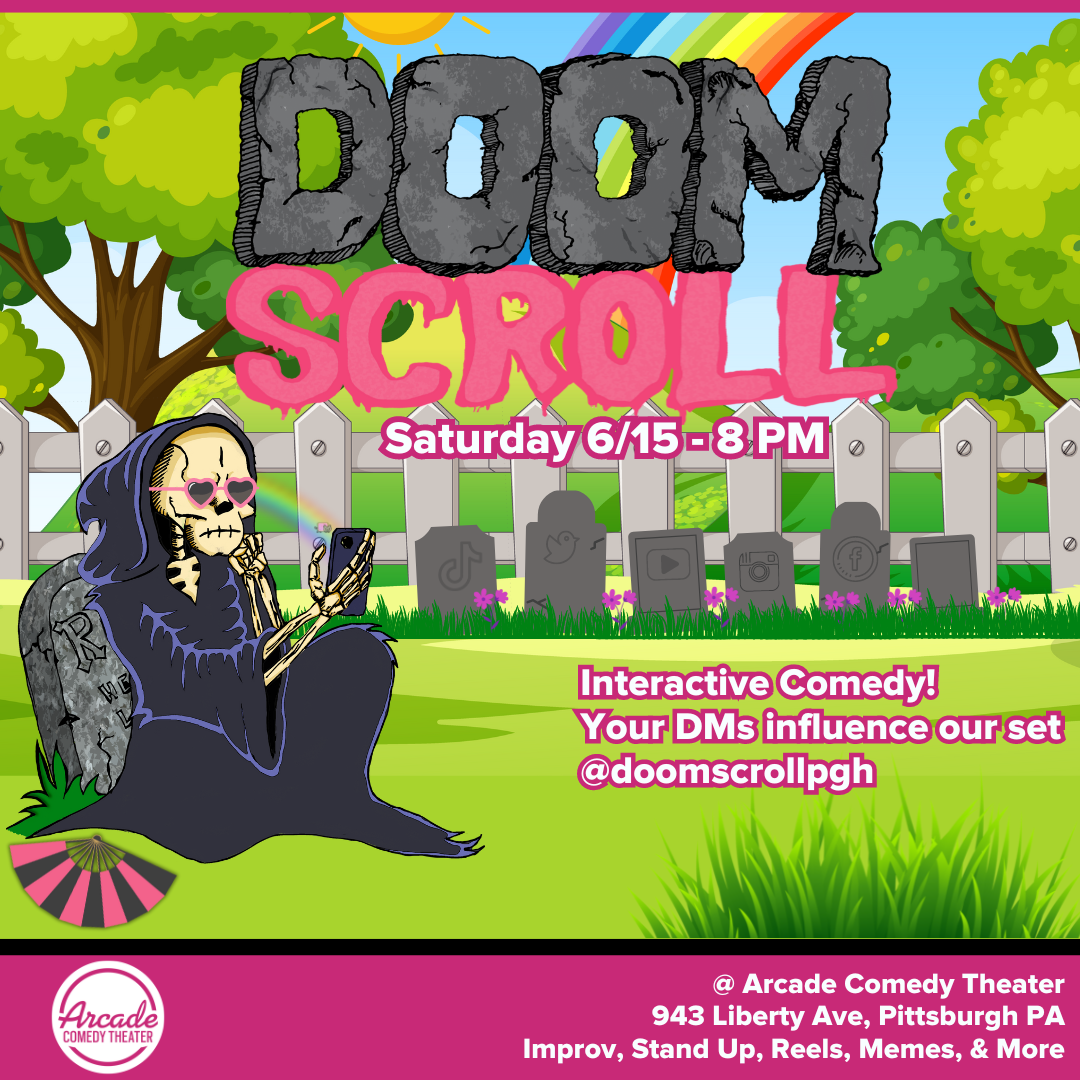 Sun’s out phone’s out! Doomscroll Comedy Show features stand up, & improv where YOU influence the show by sharing your favorite reels, & tiktoks @doomscrollpgh. It’s like your own personal meme come true. You share content and we make up an entire show around it!