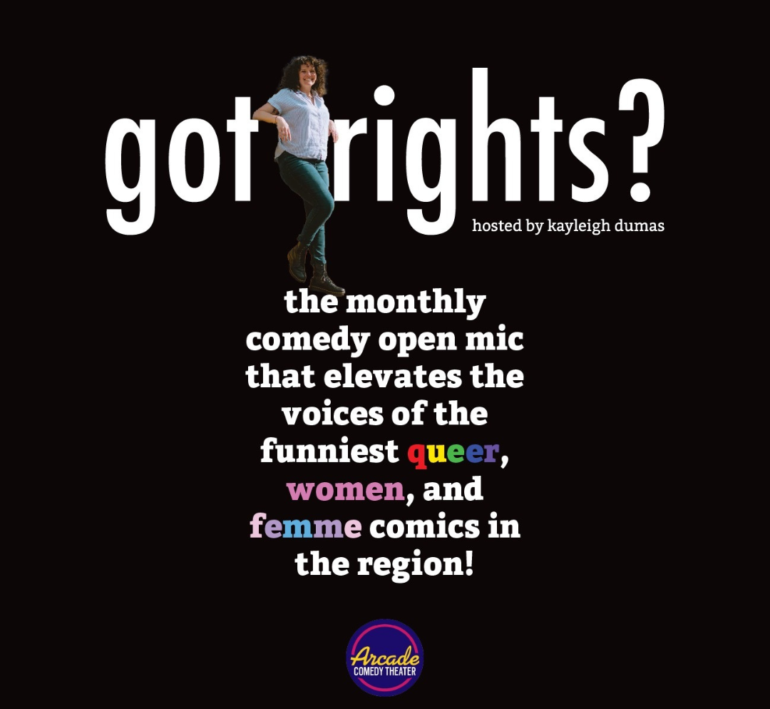 Arcade Comedy Theater presents Got Rights? – a monthly comedy open mic that celebrates and centers comedy from queer individuals, women, and femmes! Join us in our black box theater upstairs Thursday, January 16, at 10pm and witness some of Pittsburgh’s most talented and available comics work through their material. An open mic is not a show. It is practice, a place to try new jokes, adjust old ones, and, most importantly, take risks and make mistakes. Whether it’s good, bad, funny, or crass, YOU decide if you want to laugh. Got Rights? is the mic to support and enjoy the incredible talent from our vibrant comedy community. Bring your friends, your laughter, and your keen comedy judgment for a night of fresh perspectives and bold humor.