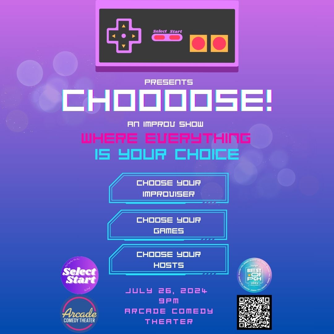 Oops! Select Start forgot to plan for a show! We need your help chooooosing a set-list of hilarious, quick-paced improv games in a multitude of different ways! Come chooooose which games we’ll play and which players will play them on the spot! Will you go easy on us or will you chooooose to make us play games you don’t think we can handle?