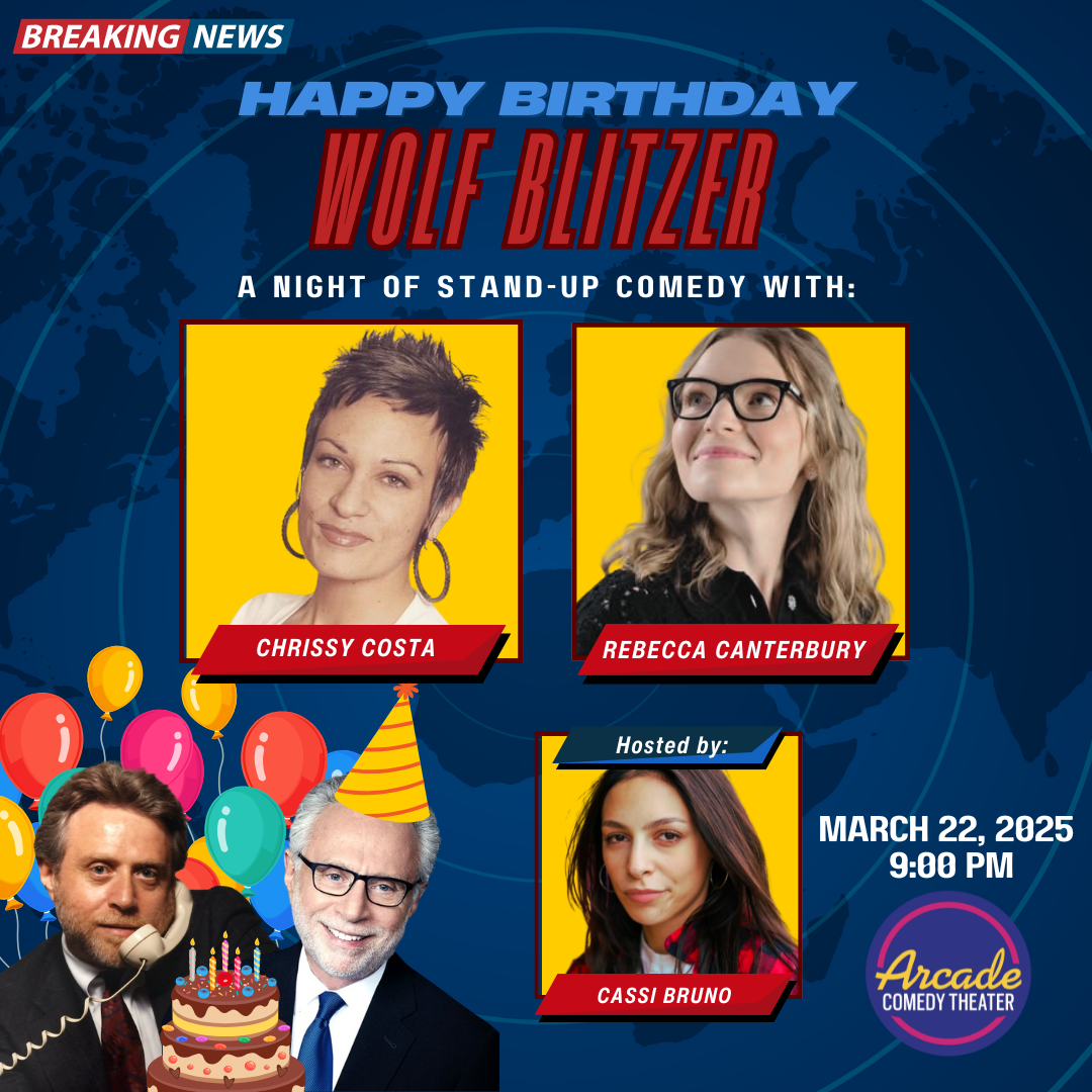 Celebrate nationally acclaimed news anchor, Wolf Blitzer’s birthday by attending a night of stand-up comedy with regionally acclaimed talent. Join Chrissy Costa, Rebecca Canterbury, and Cassi Bruno for some laughs at Arcade!